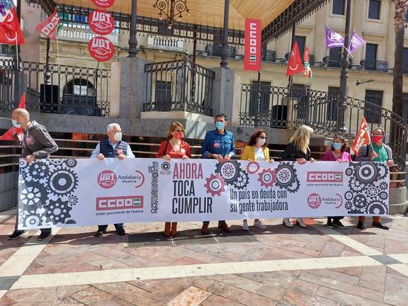 En la concentración que se ha celebrado bajo un estricto cumplimiento de los protocolos de seguridad anti-covid, en la Plaza de las Monjas de la capital onubense han participado 100 delegados y delegadas sindicales de ambas organizaciones para reclamar una recuperación justa.