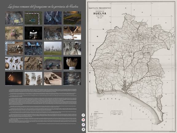La muestra incluye un mapa provincial de las fosas comunes y numerosos objetos hallados en las fosas de Nerva, Zalamea, Puebla de Guzmán e Higuera de la Sierra, además de una instalación con las fotografías de cien personas represaliadas en la provincia identificadas con su nombre.