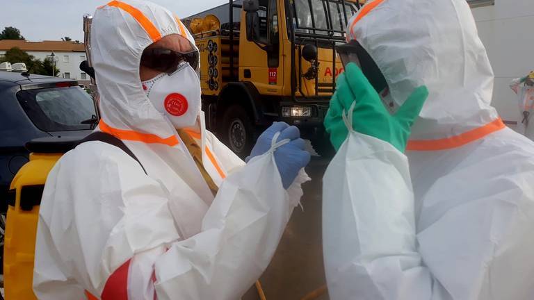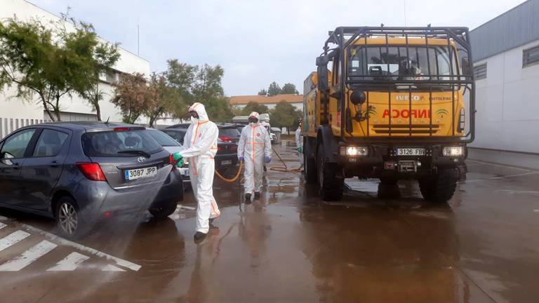 Los técnicos y bomberos del Plan Infoca en Huelva han continuado desinfectando durante este miércoles. Después de Aljaraque, Corrales durante el lunes y El Campillo y Aracena, este martes, hoy ha sido el turno de Cartaya y El Rompido donde han realizado esta tarea en el colegio Juan Ramón Jiménez, centro de mayores, edificios municipales y centros de Salud. Este jueves seguirán en Almonte y el Viernes Santo en Calañas.
