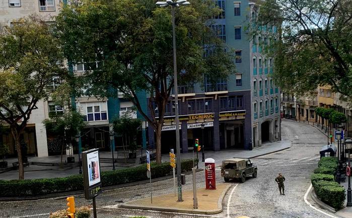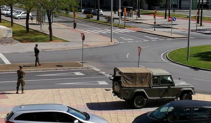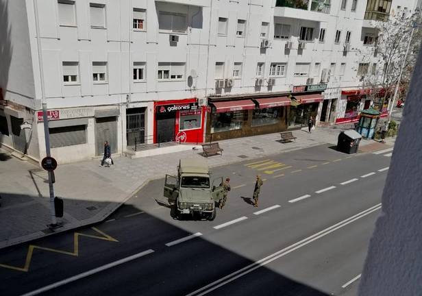 El Ejército ha desplegado va militares por las calles de Huelva capital para reforzar el control del cumplimiento del estado de alarma que ya realizan la Policía Local, Nacional y Autonómica.