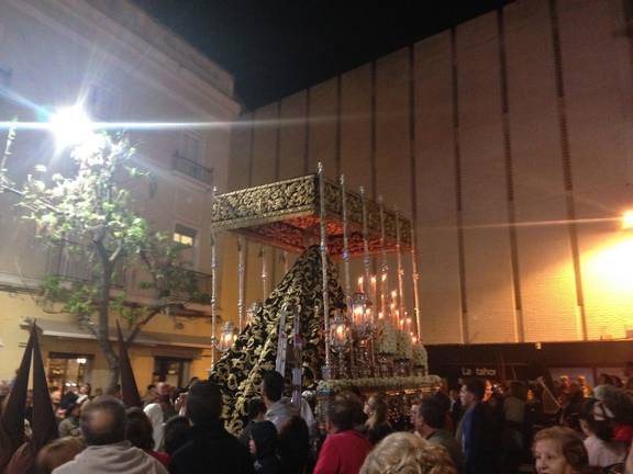 Al paso de esta Hermandad ese silencio únicamente castigado por el sonido del rachear de sus costaleros, de las cadenas en los pies de unos hermanos que hacen anónima su penitencia y las notas musicales de un Trío de Capilla visten al Lunes santo del más absoluto respeto y compromiso imponen en este acto público de fe como es la Semana Santa.