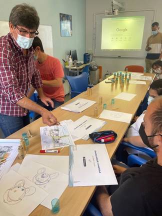 El pintor onubense Andrés Espuelas ha visitado la Asociación Onubense para la Normalización Educativa, Social y Laboral (AONES) para compartir su arte con los usuarios de la entidad. Durante una mañana emotiva e inolvidable, los chicos y chicas de la asociación tuvieron la oportunidad de participar y aprender el peculiar y genuino mundo artístico de Andrés a través de sus fantásticos dibujos. Con su particular estilo, que el mismo denomina 'curvismo', la obra de este artista onubense se ha hecho muy popular en Huelva.