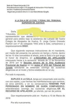 El policía local recurrió la sentencia ante el TSJA tal y como adelantó Diario de Huelva basándose en diversos criterios que incluían la nulidad del juicio por presiones al jurado.