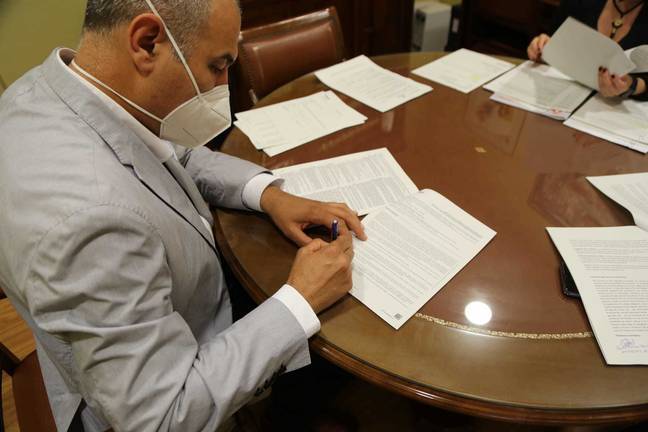 El presidente de la Real Hermandad de Emigrantes de Nuestra Señora del Rocío de Huelva, Francisco José Garrido; la secretaria, Carmen Benito; y por parte del Banco Sabadell su apoderada, Rosario de la Corte, han suscrito el acuerdo financiero en la Notaría de Francisco Ábalos, por el cual esta entidad financiera concede un crédito para llevar a cabo la ansiada ampliación de la casa de hermandad en el Paseo de la Glorieta, donde se encuentra la capilla de la Concha Peregrina.
