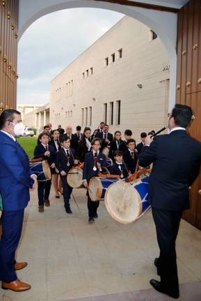 El grupo de tamborileros de Emigrantes recibía en la puerta de la casa de hermandad con los sones de la flauta y el tamboril a los asistentes que participaron en la Eucaristía que presidía el obispo de Huelva, monseñor Santiago Gómez Sierra, acompañado por el vicario y director espiritual de la hermandad, Jaime Jesús Cano Gamero, y el diácono Manuel Díaz Muñoz y que contó con el acompañamiento musical del coro de la hermandad.