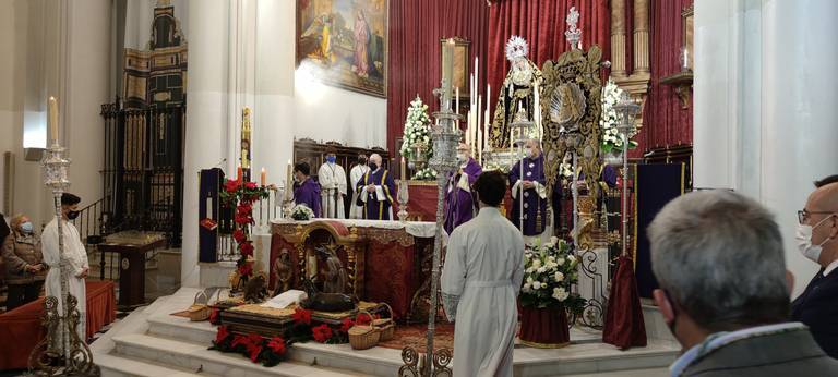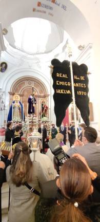 Una vez en la parroquia de la Purísima Concepción, el Simpecado de Emigrantes fue visitando a cada uno de los titulares que tienen su sede canónica en dicho templo, para seguidamente iniciar la Eucaristía celebrada por los sacerdotes Diego Capado, titular de la parroquia y director espiritual de la Santa Cruz; José Ramón Verea, vicario parroquial.