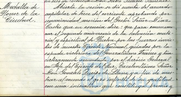 Al respecto, el portavoz del Equipo de Gobierno, Manuel Gómez Márquez, ha explicado que “la medalla de Queipo de Llano obedeció, según consta en el acta capitular de 29 de julio de 1938, a la conmemoración del segundo aniversario de la sublevación militar de 1936, a través de una distinción al general jefe del ejército nacional de Franco”. Una condecoración que, según ha destacado el concejal, “supone una exaltación de la Guerra Civil y de la represión de la dictadura, contraviniendo los preceptos de ley nacional y autonómica de memoria histórica”. Además, “hacemos justicia con los represaliados onubenses y sus familias, dando pasos hacia una sociedad más democrática y en paz con su pasado”.