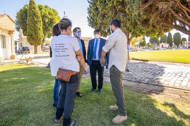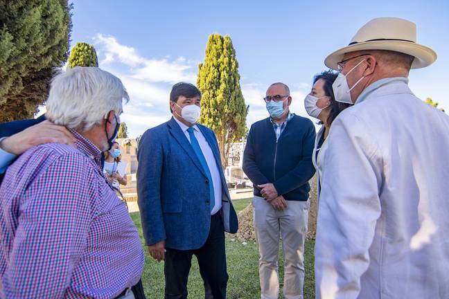 El alcalde de Huelva, Gabriel Cruz, acompañado de la concejala de Hábitat Urbano e Infraestructura del Ayuntamiento de Huelva, Esther Cumbrera, ha visitado esta mañana el cementerio de La Soledad para supervisar el inicio de los trabajos enmarcados en el ‘Plan de Recuperación de Memoria Democrática’ de la FEMP. Un proyecto subvencionado con 18.000 euros que se se centrará en la delimitación e investigación de las fosas comunes provenientes de la Guerra Civil y la Dictadura.