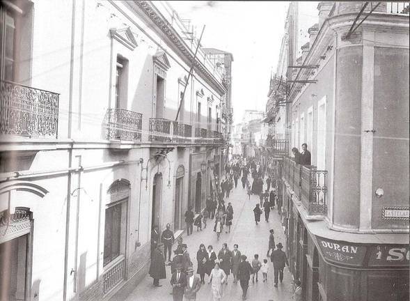 Presidida por el Gobierno Civil de Huelva (a la izquierda),nos adentramos con esta imagen en el palpitar de la ciudad a través de su calle Concepción, justamente en la confluencia con la Calle Castelar,en la actualidad Calle Rico. Llama la atención la actividad empresarial que marcaba el día a día de su tránsito, donde comercios dedicados a la venta de muebles se alternaban con sastrerías y otros en los que destacaba la majestuosidad de sus escaparates.