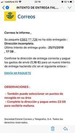 El gancho se presenta en forma de mensaje vía móvil en el que el ‘falso’ Correos le informa de que “su paquete -con número y todo- no ha sido entregado” por una supuesta dirección incompleta. Hasta le dan la oportunidad de un último intento de entrega gratuito. Eso sí para confirmar la dirección hay que clicar en el enlace que adjunta el mensaje donde piden lo de siempre: los datos de la tarjeta. Y ahí está el truco. Porque si se le ocurre pinchar en el enlace acceden a nuestros datos bancarios y le dan el sablazo en la cuenta corriente.