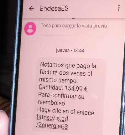 Desde una supuesta cuenta de la eléctrica están llegando mensajes reiterados y en algunos casos por duplicado a los números de móvil de clientes reales. En ellos explican un supuesto error: “Notamos que pagó la factura dos veces al mismo tiempo”, reza el mensaje. Incluso indican una cantidad coherente de consumo eléctrico para no levantar sospechas. Y, acto seguido, para confirmar el reembolso o la devolución del cobro solicitan que hagas doble click en un enlace que es el que abrirá las claves de tus cuentas.