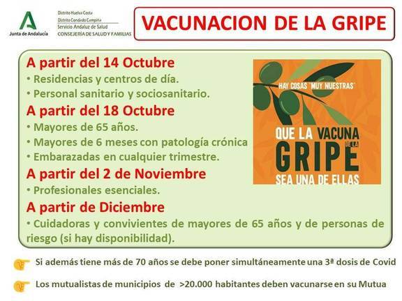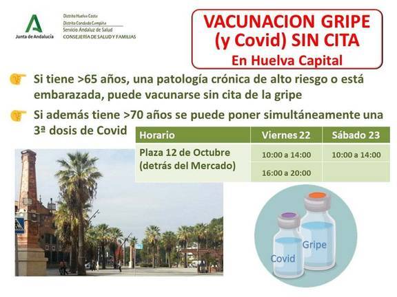 La Consejería de Salud y Familias, a través de los Distritos de Atención Primaria Huelva-Costa y Condado-Campiña, ha ampliado al lunes y viernes de la próxima semana (días 25 y 29 de octubre) las jornadas de vacunación sin cita previstas para hoy y mañana en la Plaza Doce de Octubre de la capital. Este sábado se podrá vacunar en el centro de Huelva, junto al mercado.