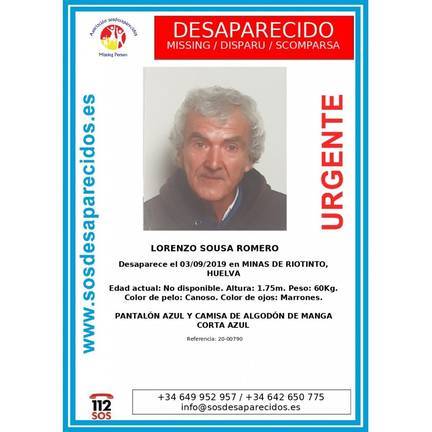 Además, la Guardia Civil mantiene activa la búsqueda de Lorenzo Sousa Romero, del que ahora se cumple el segundo aniversario de su desaparición. Sus familiares denunciaron su falta en Minas de Riotinto y desde entonces no han dejado de buscarlo. En el momento de su desaparición, Lorenzo llevaba pantalón azul y camisa de algodón de manga corta azul.