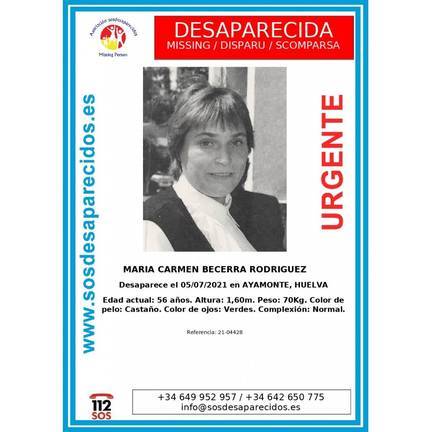 Ya son tres las personas desaparecidas este verano en la provincia de Huelva de las que sus familiares todavía no tienen noticias. Junto al caso de Antonia Almansa, la joven de 24 años desaparecida el pasado sábado en el municipio de Paymogo, la Policía mantiene activos otros dos casos de personas de las que aún se desconoce su paradero. Se trata de María Carmen Becerra, desaparecida en Ayamonte hace dos meses. Desde la asociación SOS Desaparecidos detallan que la mujer tiene actualmente 56 años y mide 1,60, es de complexión normal y tiene el pelo castaño y los ojos verdes.