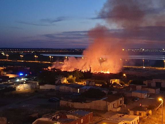 Los Bomberos de Huelva se tuvieron que emplear a fondo anoche para extinguir un incendio de pastos, maleza y jardines ocurrido sobre las 22.00 horas junto a la barriada de La Navidad, Santa Lucía y Marismas del Odiel.