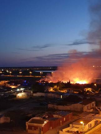 Un incendio nocturno en Marismas del Odiel pone en jaque a las viviendas de la barriada