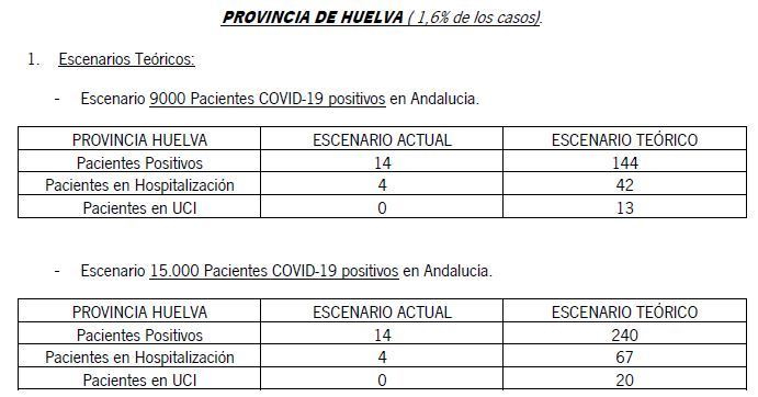 En este primer documento, la autoridad sanitaria andaluza preveía dos escenarios para la provincia de Huelva. En el primero de ellos (Plan 9.000) reconocía que la provincia estaría preparada para asumir escenarios teóricos de 42 hospitalizaciones y 13 pacientes en UCI. Y en el segundo (Plan 15.000) marcaba en 67 las hospitalizaciones y 20 pacientes en UCI. Según la Junta, con estos dos escenarios teóricos, Huelva no precisaría activar ningún plan provincial.