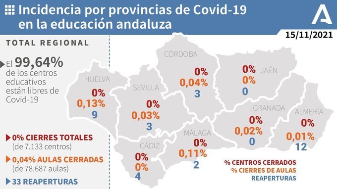 Aun así, en este momento en la provincia de Huelva no hay ningún cierre completo de un total de 487 centros (0%). Sí se ha decidido el cierre parcial de 7 aulas de un total de 5.211 (0,13%), y 9 reaperturas, más las 26 de la semana pasada.