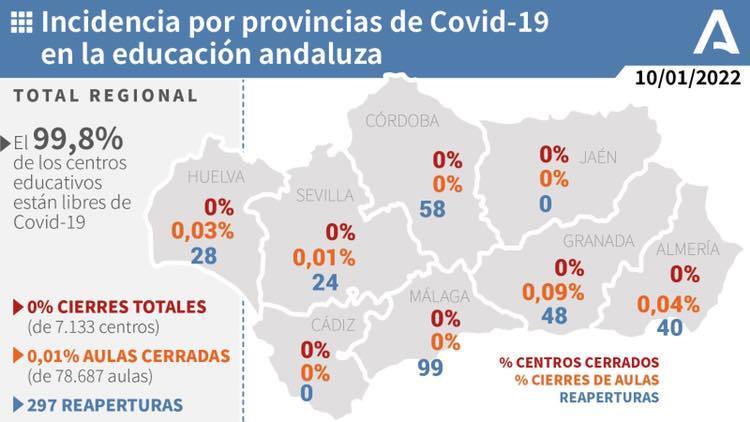 Cierres totales o parciales y reaperturas a 17 de enero: ningún cierre completo de centros (de 7.133 centros, un 0%), 153 aulas (de 78.687 aulas, un 0,19%) y 51 reaperturas. Es decir, de las 153 aulas cerradas actualmente en Andalucía casi 100 (95 en concreto) lo están en Huelva.