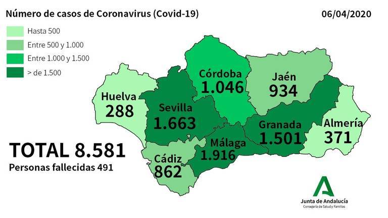 Andalucía alcanza ya los 8.581 afectados por coronavirus tras sumar solo 280 positivos, lo que supone un significativo retroceso respecto a los 432 de este domingo y a los 495 de este sábado. Además, los fallecidos ascienden a 491, 21 más en 24 horas, la mitad de las muertes registradas el sábado.