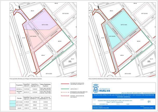 La Junta de Gobierno del Ayuntamiento de Huelva ha aprobado hoy de forma definitiva el expediente para la ocupación directa de dos parcelas destinadas a dotaciones públicas en el Ensanche Sur, así como sus viarios circundantes, al objeto de agilizar la concesión de las licencias municipales para la construcción del colegio público y la residencia para personas mayores previstos en este sector de expansión de la capital.