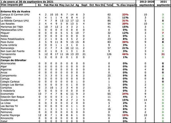 Tal y como muestra el gráfico de seguimiento, entre enero y septiembre (no aparece aun reflejado este último episodio de octubre) se han producido 62 días de impacto de SO2 en el Campus Universitario de El Carmen, una de las zonas más afectadas; 85 días en el otro Campus de la UHU, en La Rábida, 83 en Pozo Dulce, y 54 en el populoso barrio de Los Rosales. Y llaman la atención, aunque la causa es obvia, los 126 días de impacto de la zona industrial externa de Torrearenilla.