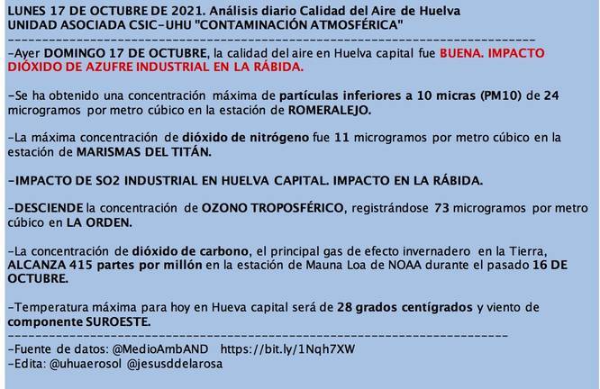 Hasta el pasado 15 de octubre ha sufrido Huelva capital uno de los episodios contaminantes de origen industrial por SO2 (dióxido de azufre) más largos de los últimos meses. Comenzó el pasado 6 de octubre, según reflejaban ya las cabinas de vigilancia y control que revisa la Unidad de Calidad del Aire de la Universidad de Huelva, y a priori ha concluido con la recogida de datos (buenos) de las dos últimas jornadas del pasado sábado y domingo 16 y 17 de octubre. La climatología, calima, vientos predominantes han agravado los datos fabriles. ¿Ha tenido algo que ver el volcán de La Palma y el desplazamiento de su nube tóxica? De momento, no hay datos que lo corroboren.