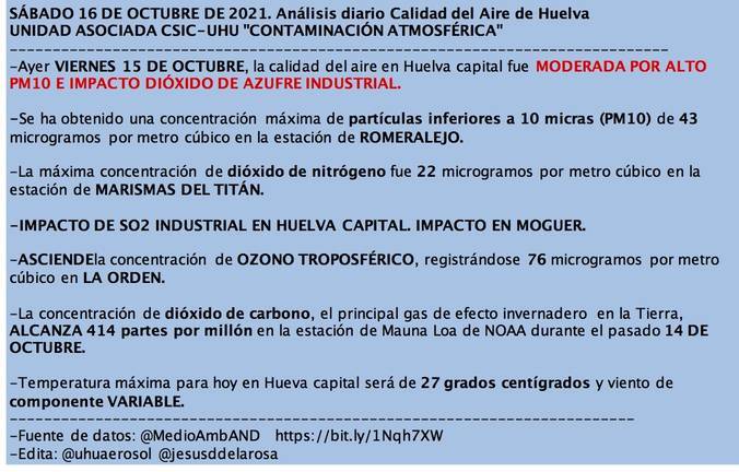 El viernes 15 de octubre la red de vigilancia y alerta volvió a marcar la presencia significativa de PM10 y dióxido de azufre de origen industrial. La máxima concentración de dióxido de nitrógeno se dio en Marismas del Titán y se marcó de nuevo el impacto de So2 en Huelva y Moguer.