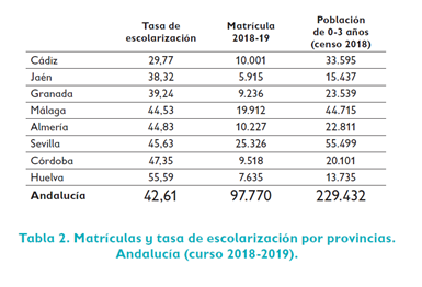 Este informe explica que el aumento de las matriculaciones en esta franja edad ha sido debido al aumento de la oferta de centros privados y que no ha ido acompañado de una planificación que se adecue a las demandas ni a las necesidades sociales. Además, pone de manifiesto las diferencias de calidad existentes entre las escuelas públicas de titularidad de la Junta de Andalucía y los centros adheridos privados, ya que los centros públicos son los que están mejor financiados, tienen mejores infraestructuras y servicios de asistencia.