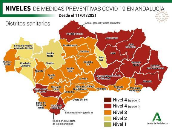 Y en el nivel 3 el resto, Distrito Huelva-Costa, la más afectada. Incluida la capital y el Área Metropolitana.