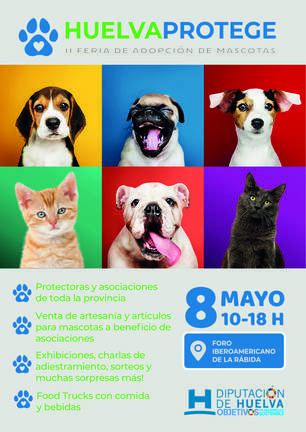 La Diputación de Huelva, a través del Servicio de Medio Ambiente, organiza el próximo domingo, 8 de mayo, la segunda edición de la Feria Provincial de adopción de animales ‘Huelva protege’ con la que se pretende informar sobre el respeto y la protección animal y concienciar a la ciudadanía sobre la necesidad de alcanzar el ‘abandono cero’ a través de la labor que desempeñan numerosas asociaciones protectoras de animales de la provincia, las cuales – trece en total- estarán ubicadas en carpas individuales de 25m2 perfectamente acondicionadas para el bienestar de los perros y gatos que participen en la feria con el objetivo de que los visitantes puedan formalizar allí su futura adopción.