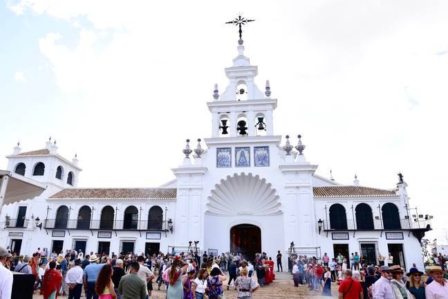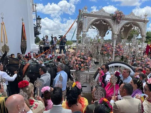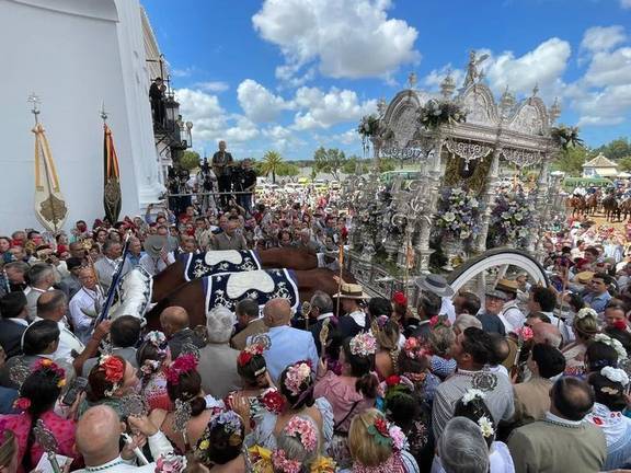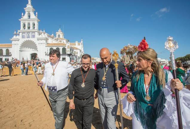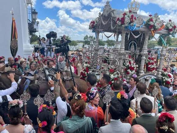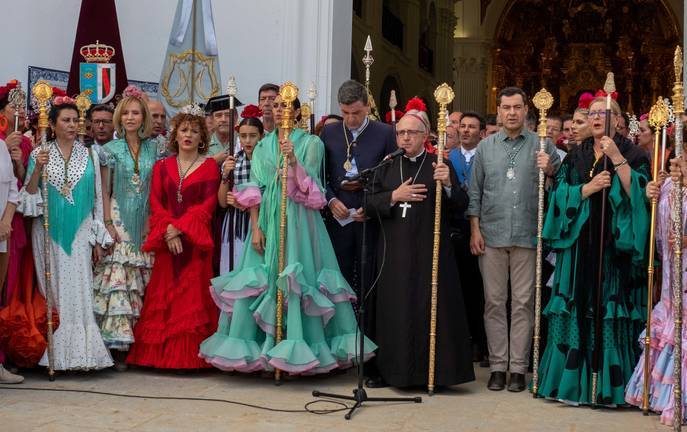 Allí fueron recibidos por el presidente de la Hermandad Matriz del Rocío de Almonte, Santiago Padilla, y la Hermana mayor, Rocío Corona. Juntos rezando la salve y rememorando un rito que Huelva llega ejerciendo desde 1880, sólo interrumpida por la pandemia.