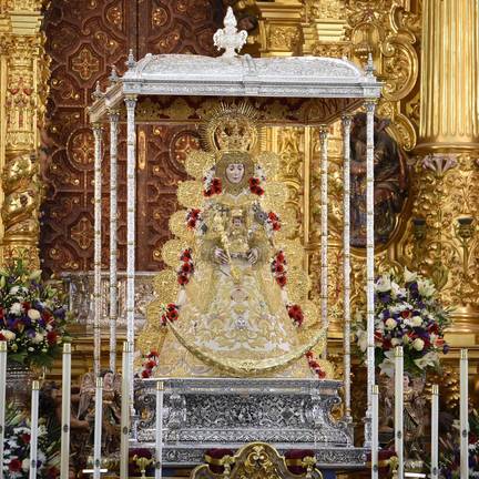 Luciendo con orgullo su medalla en el pecho y al grito de Huelva, Huelva, Huelva, la carroza con el simpecado se postró frente a la Virgen del Rocío que, desde el pasado domingo, preside el Santuario marismeño. Fue tras hacer lo propio otra filial de peso y solera como San Juan del Puerto y, anteriormente, Rociana.