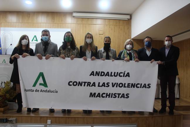 Ambas, acompañadas de una representación de delegados territoriales y otros representantes de la Administración andaluza, han guardado un minuto de silencio en recuerdo de las víctimas de esta lacra social, sosteniendo una pancarta en la que podía leerse “Andalucía contra las Violencias Machistas”.