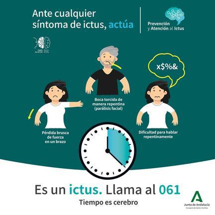 La Consejería de Salud y Familias ha puesto en marcha en los últimos días la campaña de prevención y atención al ictus ‘Es un ictus. Llama al 061’, dirigida a concienciar e informar a la población en general, y especialmente a las personas mayores de 60 años, de los síntomas y signos asociados a esta patología, facilitando su asistencia inmediata, así como de los factores de riesgo asociados y los hábitos saludables para prevenirla.