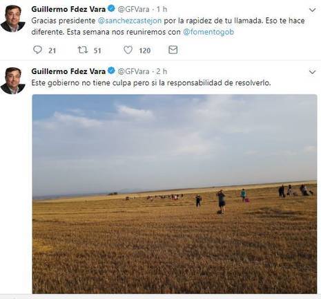 Poco después, Fernández Vara ha recibido una llamada del presidente del Gobierno, Pedro Sánchez, para interesarse sobre lo ocurrido, tras lo que han acordado una reunión la próxima semana con Fomento, ha relatado en la red social.