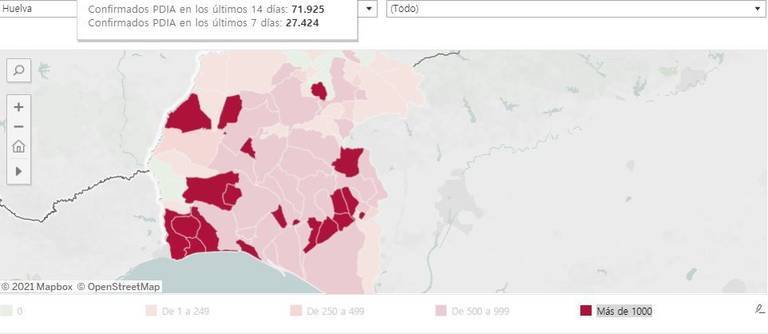 En estos momentos Huelva se coloca en la tercera posición en el ranking andaluz de los municipios con mayor tasa de contagio (por detrás de Almería y Cádiz), con 5.008 positivos acumulados en 14 días.