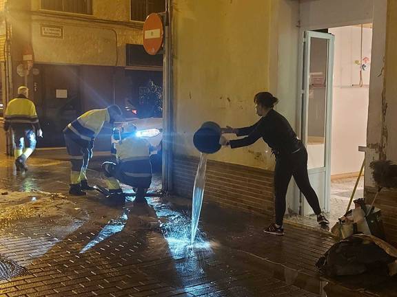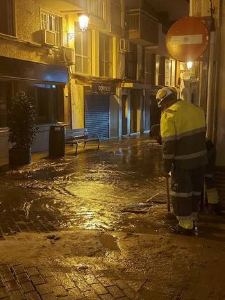 Desde las 21:15 se encontraban los operarios tratando de frenar este torrente que al caer calle abajo, se iba colando por diversos negocios de la zona.