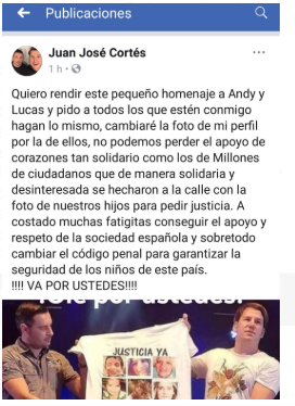 Ahora, Juan José Cortés, el padre de la niña Mari Luz Cortés, asesinada en Huelva, tercia y se pronuncia para apoyar al dúo. "Todas las veces que llevéis la foto de mi hija os estaré agradecido". Cortés dice que rinde homenaje al dúo cambiando su foto de perfil en redes sociales por la de Andy y Lucas. Asegura que "no podemos perder el apoyo de millones de ciudadanos que de manera solidaria y desinteresada se echaron a la calle con la foto de nuestros hijos para pedir justicia. Ha costado muchas fatiguitas conseguir el apoyo de la sociedad española y sobre todo cambiar el código penal para garantizar la seguridad de los niños de este país".