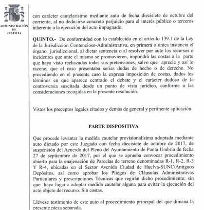 El 18 de octubre el Juzgado de Huelva otorgó a Hernández Cansino una medida cautelar de suspensión del procedimiento de venta y hoy, 9 de noviembre, ha ordenado levantar esa medida, en favor del Ayuntamiento.