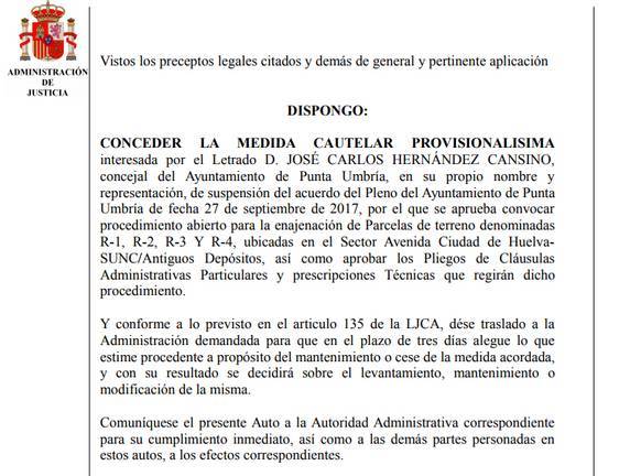 Según destaca el auto del juez, al que ha tenido acceso diariodehuelva.es, con las medidas cautelares se trata de asegurar la eficacia de la resolución que ponga fin al proceso o, como dice expresivamente el artículo 129 de la LJCA, "asegurar la efectividad de la sentencia".