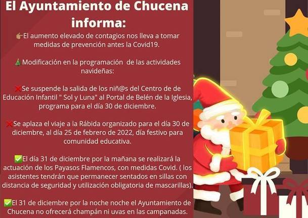 El día 31 de diciembre por la mañana se realizará la actuación de los Payasos Flamencos, con medidas Covid. ( los asistentes tendrán que permanecer sentados en sillas con distancia de seguridad y utilización obligatoria de mascarillas). Pero el 31 de diciembre por la noche noche el Ayuntamiento de Chucena no ofrecerá champán ni uvas en las campanadas.