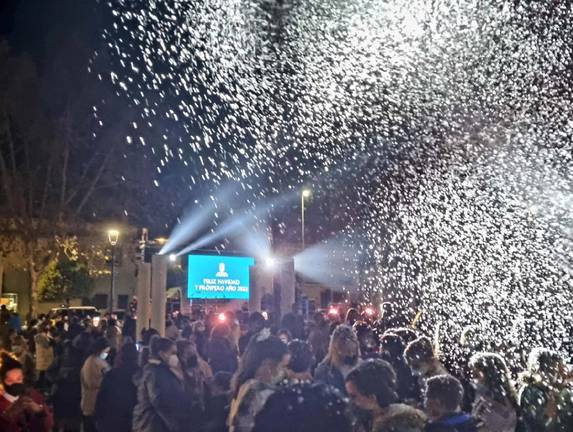 Mientras... en Aljaraque la plaza Siesta fue ayer escenario de una tarde muy especial. Las Soles deleitaron con su gran e inimitable arte ofreciendo un precioso repertorio de sus principales temas acompañándolo de conocidos villancicos y hasta de fandangos de Huelva, mientras que el broche de oro a la extensa programación navideña organizada por el consistorio para este 2021 lo ha puesto las doce campanadas, que han servido para dar una bienvenida anticipada al 2022 en una cita en la que tampoco ha faltado la nieve.