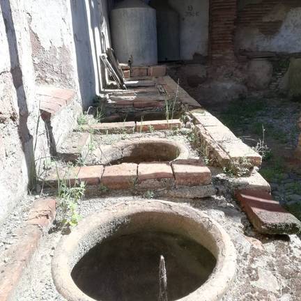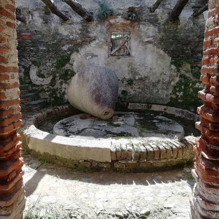 La antigua crujía situada al este se divide en planta baja para usarse, en un caso, como molino con piedra molinera cónica de granito movida por bestias (molino de sangre); y, en el otro, como almacén de aceite con tinajas adosadas a los muros, ambos conservados en aceptable estado pese a los muchos años de abandono.