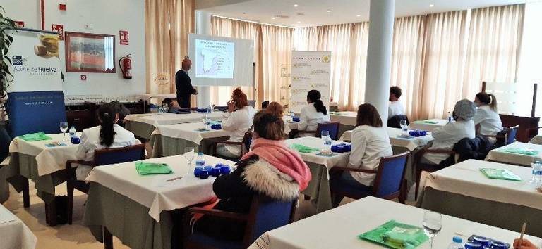 De igual modo, todo el alumnado ha podido participar en una Jornada teórico-práctica, sobre el estudio del aceite de oliva virgen extra que se produce en la provincia de Huelva, donde se han abordado aspectos como las variedades y calidades de dichos aceites, con la realización de catas para la comprobación aromática y sabores, según las explicaciones técnicas que ha ofrecido Francisco Domínguez Calvo, gerente de la Cooperativa Nuestra Señora de la Oliva de Gibraleón, acompañado en esta ocasión por María del Carmen Pérez Prieto, experta en cata de aceites.