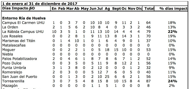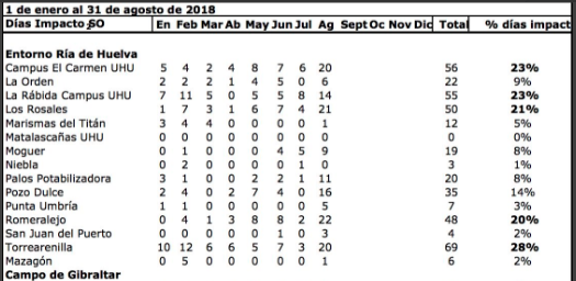 Los datos obtenidos y alojados en la base de datos de la Universidad de Huelva y en la Consejería de Medio Ambiente andaluza oscilaban en sus mediciones entre 2 y 12 días de impacto de SO2 al mes pero las tablas de los meses de verano, sobre todo agosto, han advertido un impacto de hasta 20 días en la red de medidores ambientales ubicada en el Campus universitario de El Carmen o de 21 días en la barriada de Los Rosales y zona de Pozo Dulce.