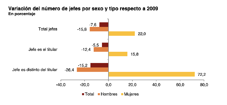 A pesar de esta situación, el Censo Agrario advierte de que el número de mujeres jefas de explotación ha aumentado un 22 % entre 2020 y 2009, representando este último un 28,6% del total. Por el contrario el número de hombres jefes de la explotación decreció un 15,8% lo que supone un importante descenso en la brecha de género que sostiene tradicionalmente el sector primario.