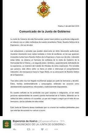 La Junta de Gobierno de la Esperanza lamenta que han recibido muchas quejas de hermanos y devotos "heridos sentimentalmente y compungidos" ante estas acciones "esperpénticas, rebuscadas y maliciosamente disparatadas". Por ello, han anunciado la toma de medidas para evitar que se repita.