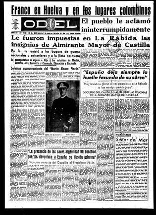 De su discurso al recoger las insignias de Almirante Mayor de Castilla, el Odiel destaca palabras como "España deja siempre la huella fecunda de su surco"; "hoy revive su gloria al ver acercarse a La Rábida a los novios americanos"; "la presencia de las naves argentinas en nuestros puertos devuelven a España su ilusión primera".
