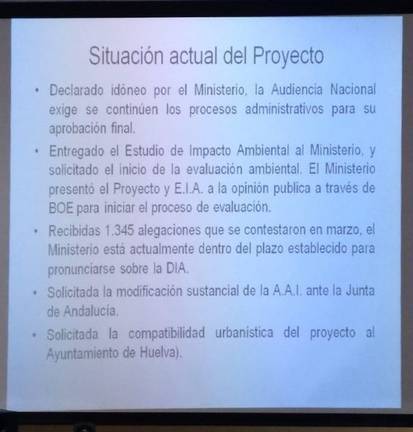 Sobre el rechazo político que ha suscitado el proyecto en la Junta de Andalucía y en el Ayuntamiento de Huelva, Juan Ramón Miró dice que no ha oído la opinión de la Administración regional después de presentar las mejoras al proyecto, incluida la respuesta y posibilidades de tsunamis o sismos. Y tampoco ha confirmado que el Ayuntamiento de Huelva presentara el informe de incompatibilidad urbanística relativo al Plan General de Ordenación Urbana que anunció en su día.